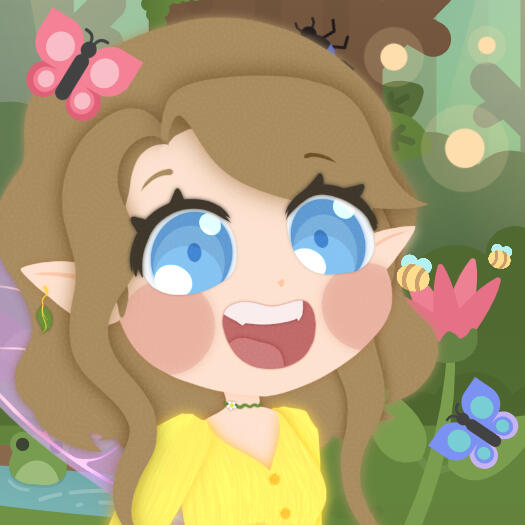 Eithne Faeria (aka the Silly Citadel or Silly Spire) is a faespire kingdom of hilarity and joy located in the sundrenched Will'o'woods of the faewilds. It is built upon a multi-trunk species of eldertree that stands tall in an idyllic grove surrounded by colorful flora, glowing mushrooms and other eldertree kin with their own faespires. Through Eithne's dense canopy, sunlight dances on the babbling creek below which entwines with the eldertree's roots before trickling elsewhere. The architecture of the faespire twists up its trunk, the spiraling pattern broken up by large branches with willow-like foliage cloaking several structures along the way to the royal castle at the top.Eithne Faeria is ruled by a council known as the Day's Eye who now collectively oversee the denizens of this faespire after their Queen abdicated her throne. Said to be the embodiment of the eldertree itself, Enya Faerie was conjured to represent Eithne Faeria as its own member of the newly ruling council. So while she is technically an archfae, the apple fell quite far away from the tree because Enya does not take her duty very seriously, often flying off to forage and frolic whenever she pleases. While most faefolk have a penchant for nurturing the earth and caring for critters, often leading a life of domesticity and harmony with their local woodlands, Enya instead found she preferred venturing out and exploring beyond the safety of the canopy.On her travels, Enya encountered all kinds of magickal folk from goblins to dragons and managed to make friends with many beings and critters alike! One particular short-legged creature with sparkling eyes and excitable temperament, fondly named Diggity, came to be a loyal companion of hers, following her everywhere as she went about her adventures. However, as exciting as meeting fellow magickal beings were, they're not dissimilar to the faefolk, often sharing their way of life. Upon seeking something out of the ordinary, Enya had heard about a specific being that was very unlike herself. In fact, these beings didn't possess magic at all.. Humanfolk.There were, of course, none to be found in the faewilds-- or at least not for long enough to speak with one. Nevertheless, when Enya wasn't out exploring, hoping to stumble upon a human one day, she was poring over records of these beings in the Citadel's library.- September 2025