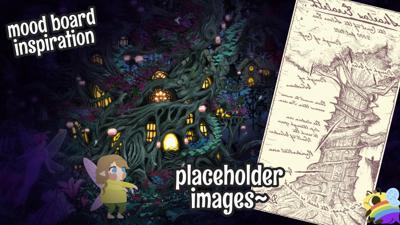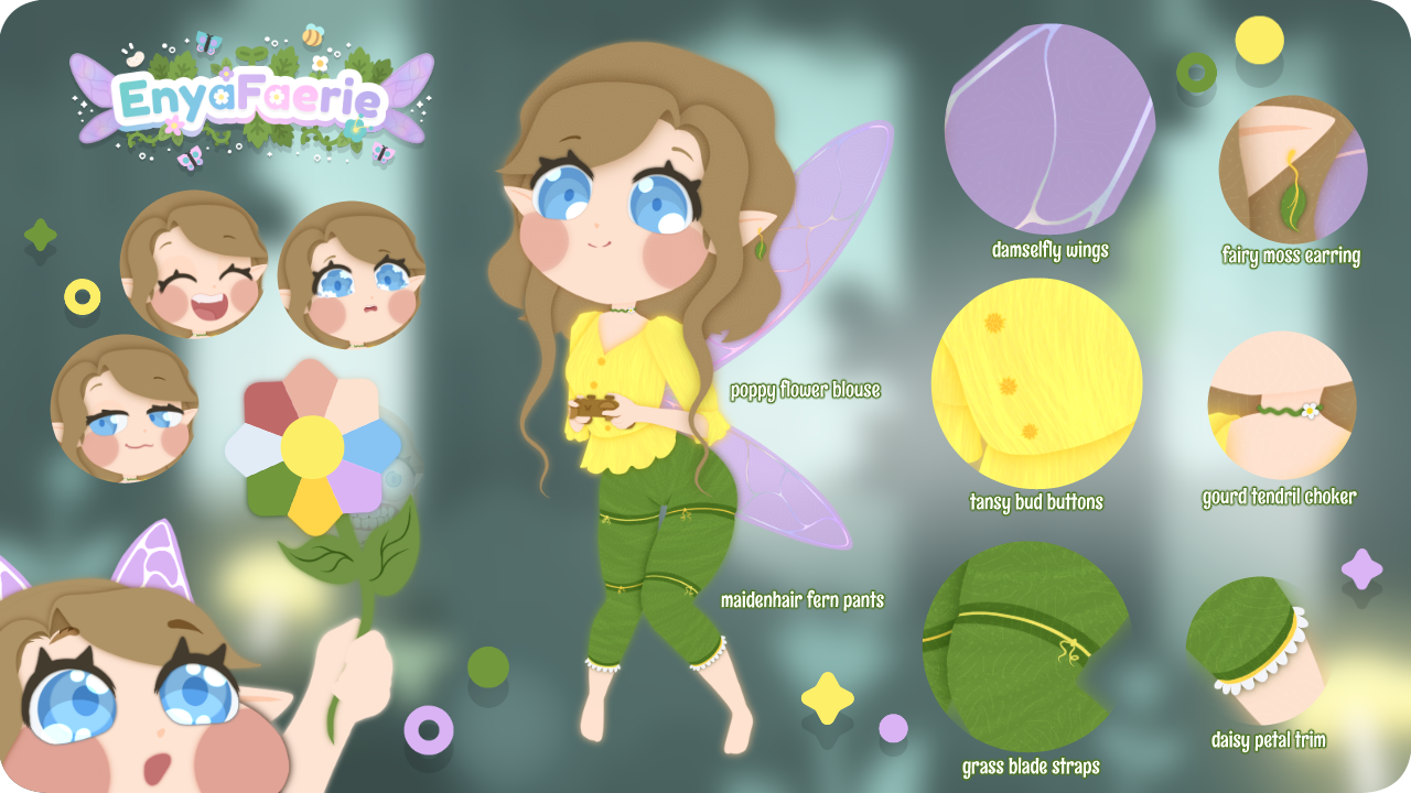 Eithne Faeria (aka the Silly Citadel or Silly Spire) is a faespire kingdom of hilarity and joy located in the sundrenched Will'o'woods of the faewilds. It is built upon a multi-trunk species of eldertree that stands tall in an idyllic grove surrounded by colorful flora, glowing mushrooms and other eldertree kin with their own faespires. Through Eithne's dense canopy, sunlight dances on the babbling creek below which entwines with the eldertree's roots before trickling elsewhere. The architecture of the faespire twists up its trunk, the spiraling pattern broken up by large branches with willow-like foliage cloaking several structures along the way to the royal castle at the top.Eithne Faeria is ruled by a council known as the Day's Eye who now collectively oversee the denizens of this faespire after their Queen abdicated her throne. Said to be the embodiment of the eldertree itself, Enya Faerie was conjured to represent Eithne Faeria as its own member of the newly ruling council. So while she is technically an archfae, the apple fell quite far away from the tree because Enya does not take her duty very seriously, often flying off to forage and frolic whenever she pleases. While most faefolk have a penchant for nurturing the earth and caring for critters, often leading a life of domesticity and harmony with their local woodlands, Enya instead found she preferred venturing out and exploring beyond the safety of the canopy.On her travels, Enya encountered all kinds of magickal folk from goblins to dragons and managed to make friends with many beings and critters alike! One particular short-legged creature with sparkling eyes and excitable temperament, fondly named Diggity, came to be a loyal companion of hers, following her everywhere as she went about her adventures. However, as exciting as meeting fellow magickal beings were, they're not dissimilar to the faefolk, often sharing their way of life. Upon seeking something out of the ordinary, Enya had heard about a specific being that was very unlike herself. In fact, these beings didn't possess magic at all.. Humanfolk.There were, of course, none to be found in the faewilds-- or at least not for long enough to speak with one. Nevertheless, when Enya wasn't out exploring, hoping to stumble upon a human one day, she was poring over records of these beings in the Citadel's library.- September 2025